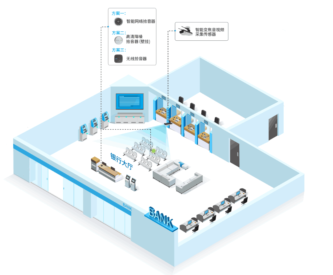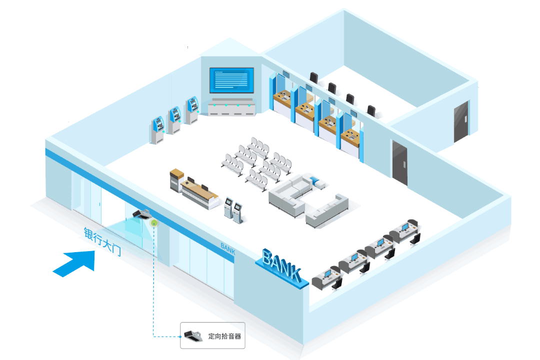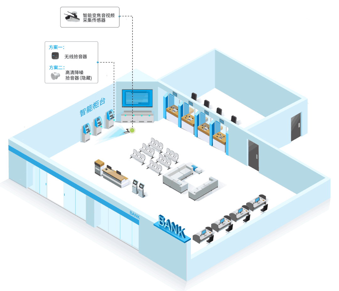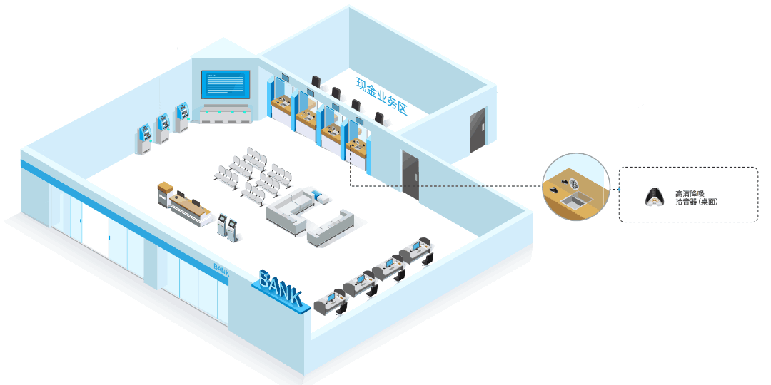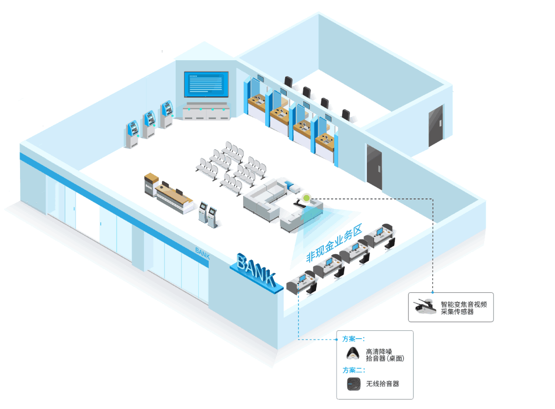 部署方案:在該區域部署一個智能變焦音視頻采集傳感器,在每個非現金柜臺處布置一個桌面拾音器(或無線拾音器)。